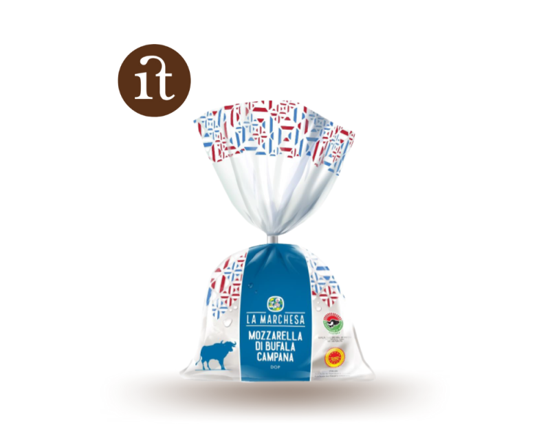 Mozzarella di Bufala Campana DOP is a fresh paste dairy product made from pure buffalo milk. Its external appearance is porcelain white, with a very thin rind of about one millimeter with a smooth surface, never slimy or flaky. The texture of Mozzarella di Bufala Campana PDO is thin, slightly elastic in the first eight to ten hours after production, with a tendency to become more melting with time; when cut, Mozzarella di Bufala Campana releases a faint whitish fatty serosity with a scent of milk enzymes.